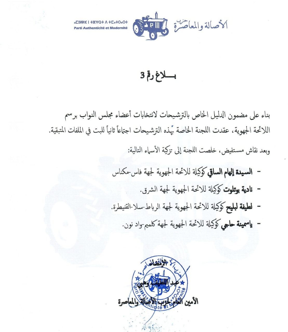 It is noteworthy that PAM’s regional list also includes: Najwa Koukouss (Casablanca – Settat), Koloub Fateh (Tangier – Tetouan – Al Hoceima), Jaouhara Bousejjada (Beni Mellal – Khenifra), Nadia Bouzandoufa (Marrakesh – Safi), Imane El Maoui (Draa – Tafilalet), Hanane Massi (Souss – Massa), El Haja El Joumani (Laayoune – Sakia El Hamra), and Chayaa Debiani (Dakhla – Oued Ed’Dahab).
