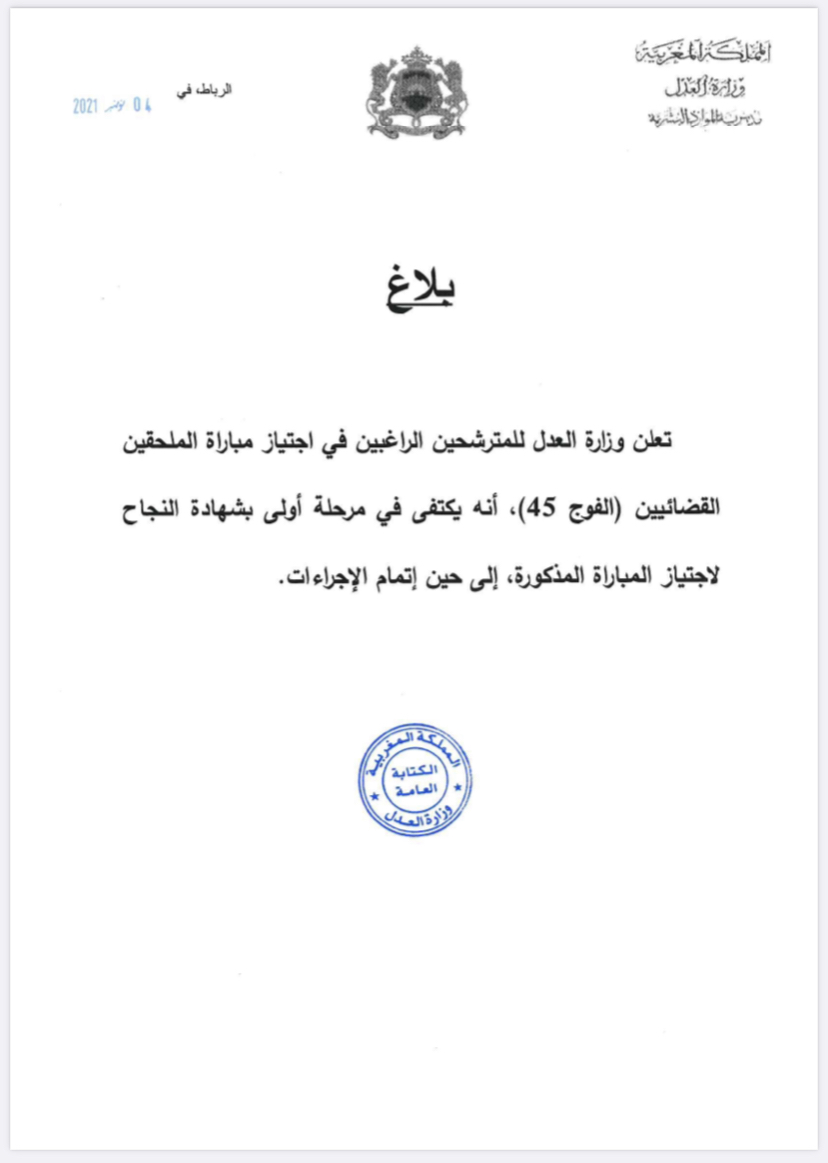 The Ministry of Justice announces to candidates interested in passing the test for judiciary attachés ( group 45) that at this early stage a diploma of success is enough as a preliminary condition to pass the exam in waiting for completing the procedures.