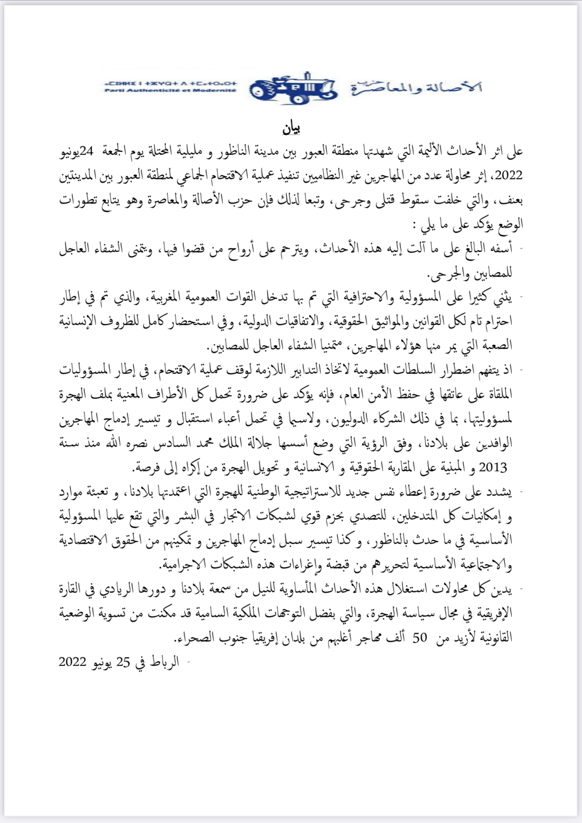 Following the sad events which occurred in the transit buffer zone between Nador and occupied Melilia last Friday, June 24, 2022, when a number of illegal immigrants have attempted a collective violent incursion into the buffer zone between both cities, and which has resulted in several deaths and wounded, the PAM, while it is following that situation development has confirmed the following: