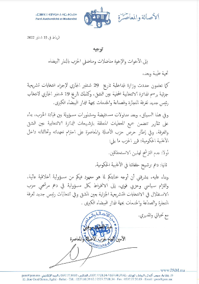 PAM Secretary General has informed the party’s militants in Casablanca that the party will neither run for elections at Ain Choq electoral district nor for the election of a new president of the chamber of commerce and industry in the area.