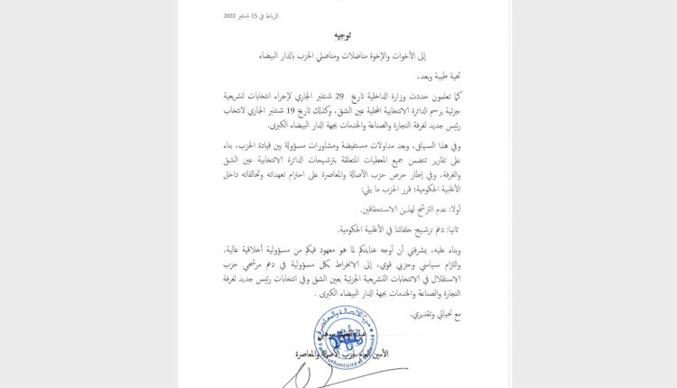 PAM Secretary General has informed the party’s militants in Casablanca that the party will neither run for elections at Ain Choq electoral district nor for the election of a new president of the chamber of commerce and industry in the area.