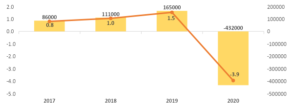 Le nombre total d’heures travaillées par semaine a baissé de 20%, passant de 494 millions heures en 2019 à 394 millions en 2020, ce qui équivaut à 2,1 millions emplois à temps plein.