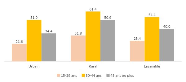 Taux d’emploi selon l’âge et le milieu de résidence (%)