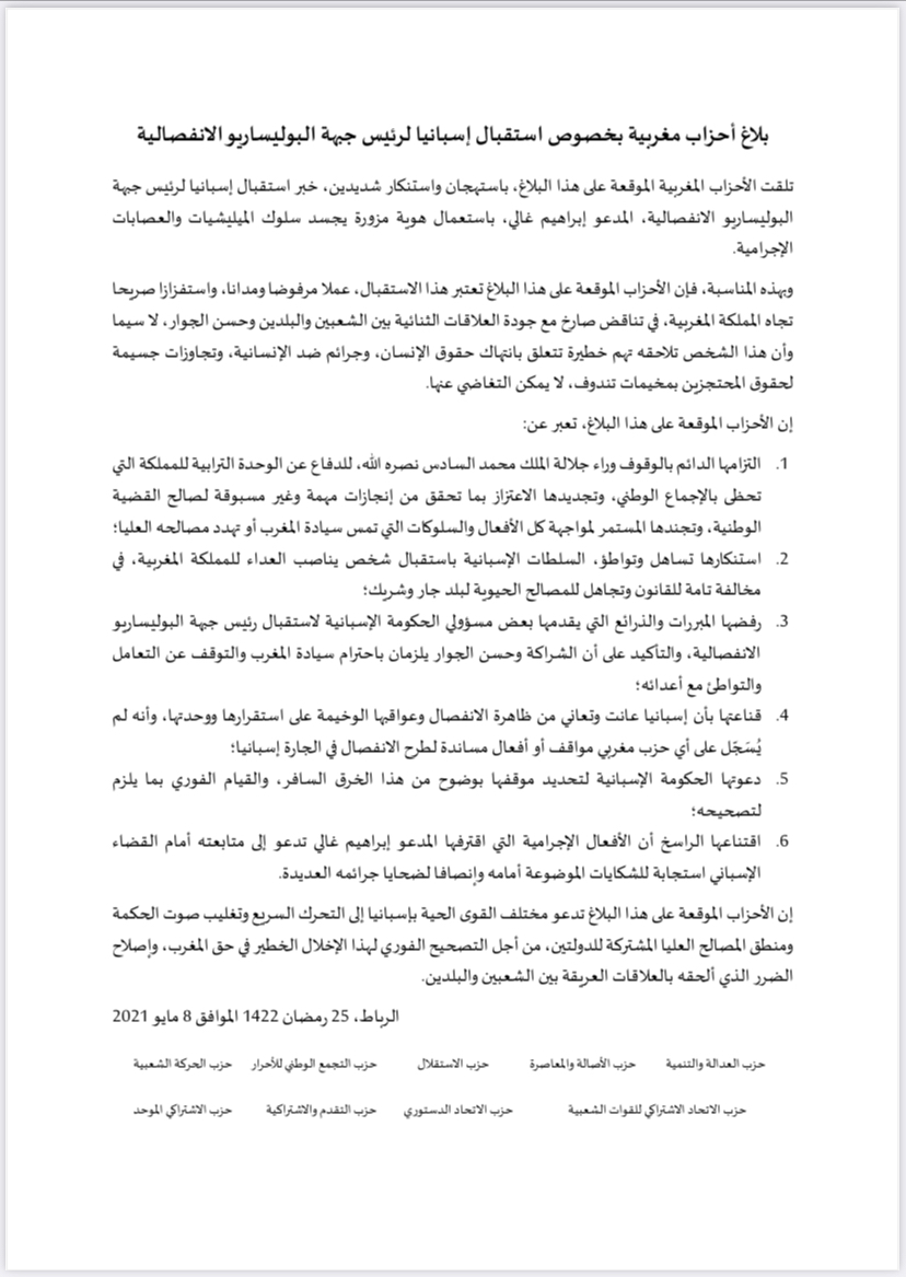 Les partis politiques marocains dénoncent l’accueil par l’Espagne du chef des séparatistes du Polisario (Communiqué)