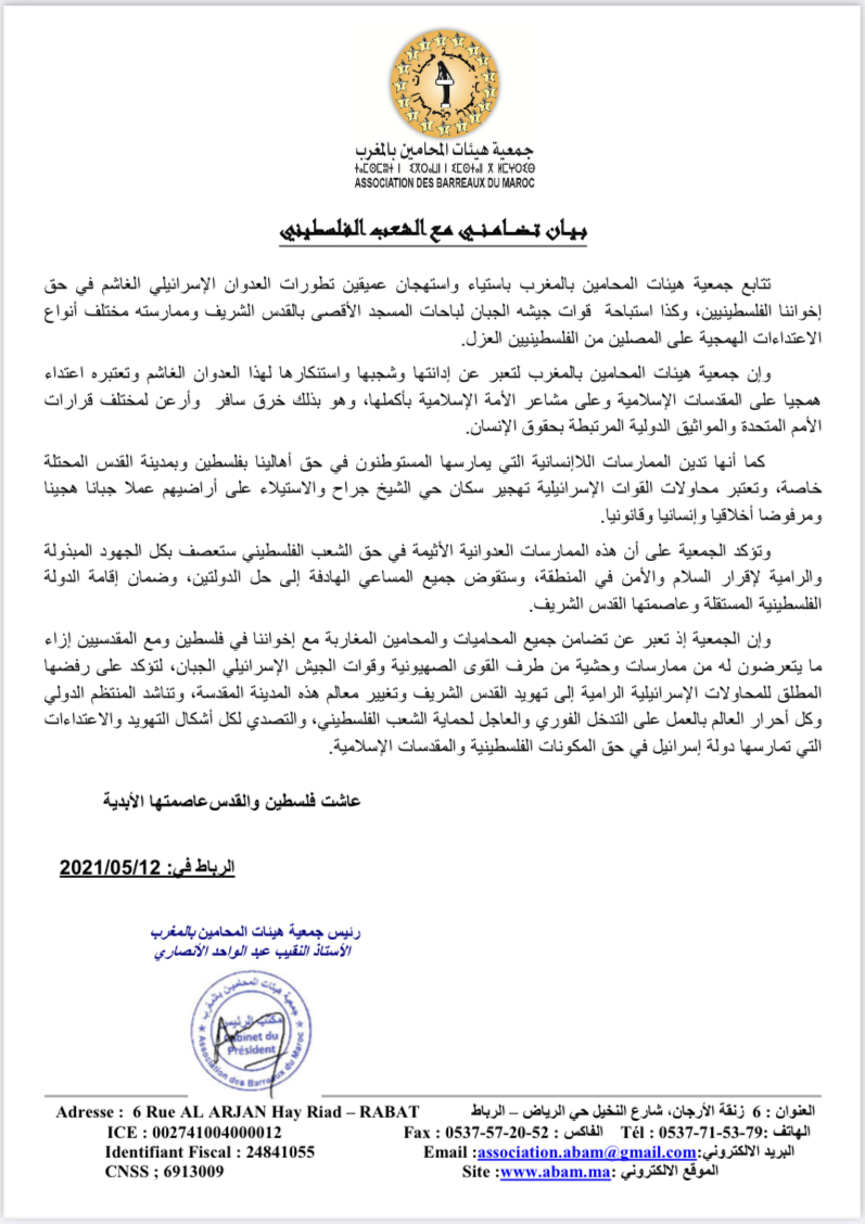 L’Association des barreaux du Maroc souligne également son « rejet catégorique des tentatives israéliennes visant la judaïsation et le changement des caractères de la ville sainte d’Al Qods et en appelle à la communauté internationale et à tous les peuples libres à travers le monde à oeuvrer pour une intervention urgente afin de protéger le peuple palestinien, et faire face à toutes les formes de judaïsation et d’agressions menées par l’État d’Israël contre les Palestiniens et les lieux sacrés islamiques ».