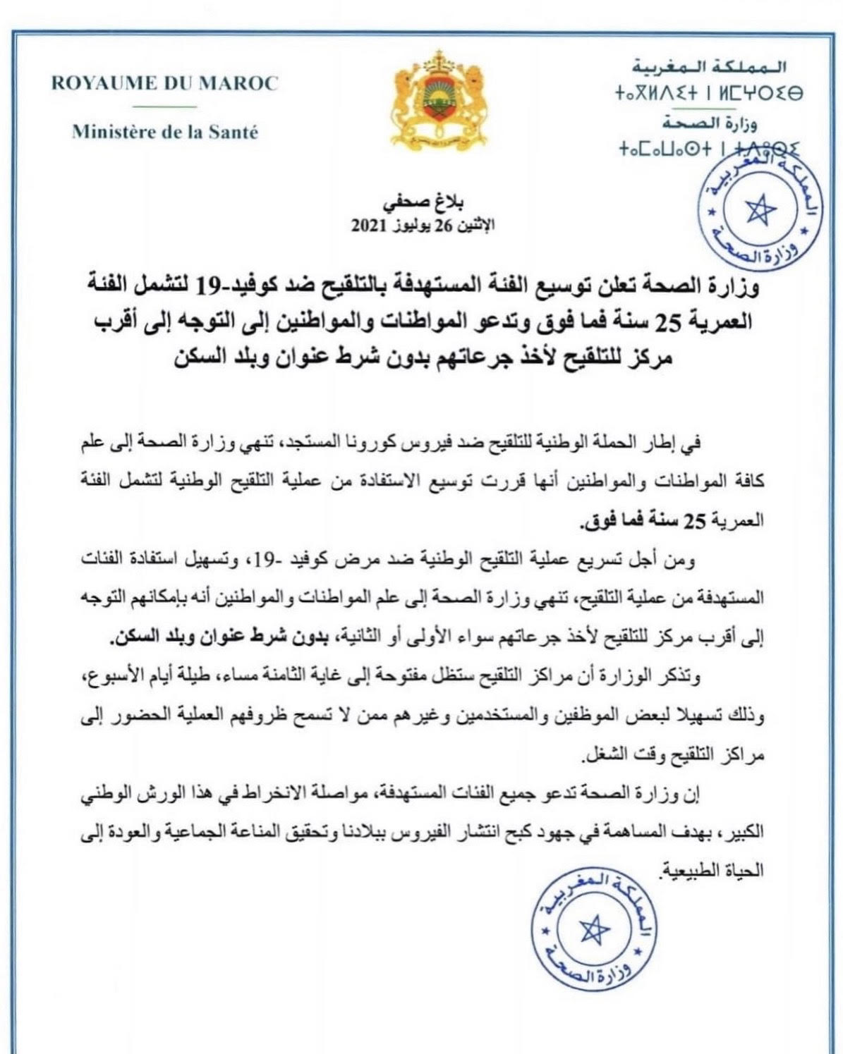 Le ministère de la Santé a annoncé que la catégorie d’âge de 25 ans et plus bénéficiera désormais de la campagne de vaccination anti Covid-19 et que les conditions liées au domicile ne sont plus en vigueur.