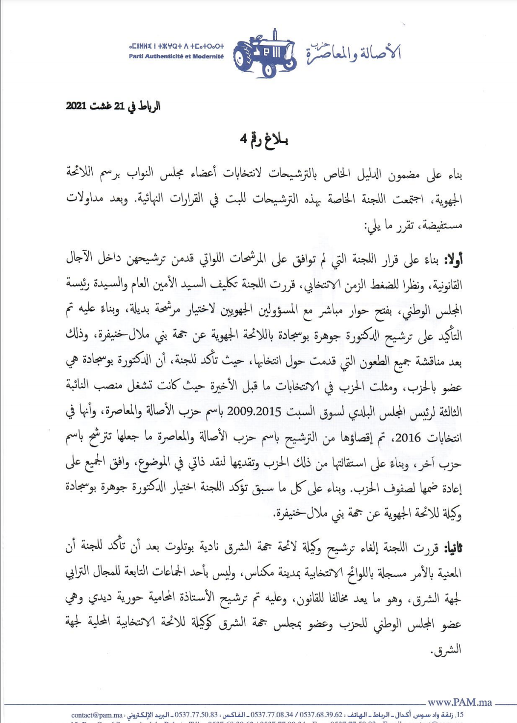 La commission, après avoir examiné tous les recours au sujet de la candidature de la mandataire de la région Beni Mellal-Khénifra, soutient que le Dr Bousjada est une militante du PAM, a représenté ce parti lors des dernières élections et occupé les fonctions de 3ème vice-président du conseil municipal de Souk Sebt au nom du PAM, durant la période 2009-2015 .