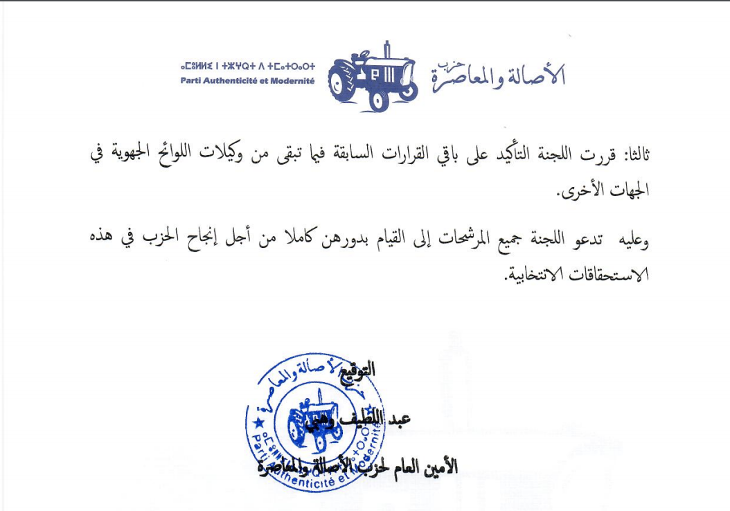 A la lumière ce ces faits, la commission a retenu la candidature de l’avocate Houria Didi, membre du conseil national du parti et du conseil de la région de l’Oriental, en tant que mandataire de la liste régionale des femmes du PAM dans cette région.