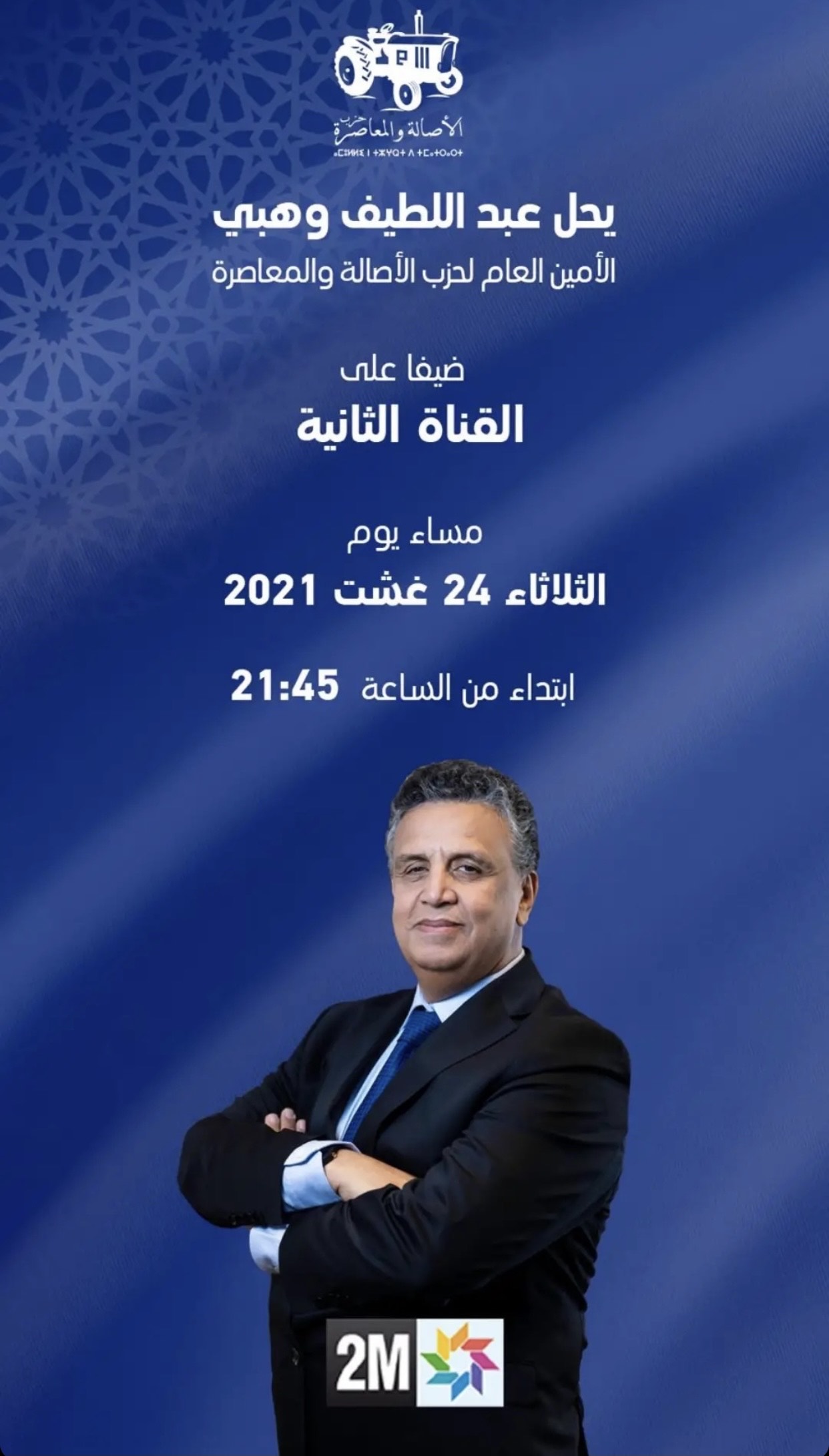 Abdelatif Ouahbi, Secrétaire général du Parti Authenticité et Modernité (PAM) sera l’invité de l’émission “انتخابات 2021” (élections 2021) de la chaîne télévisée 2M, ce mardi soir.