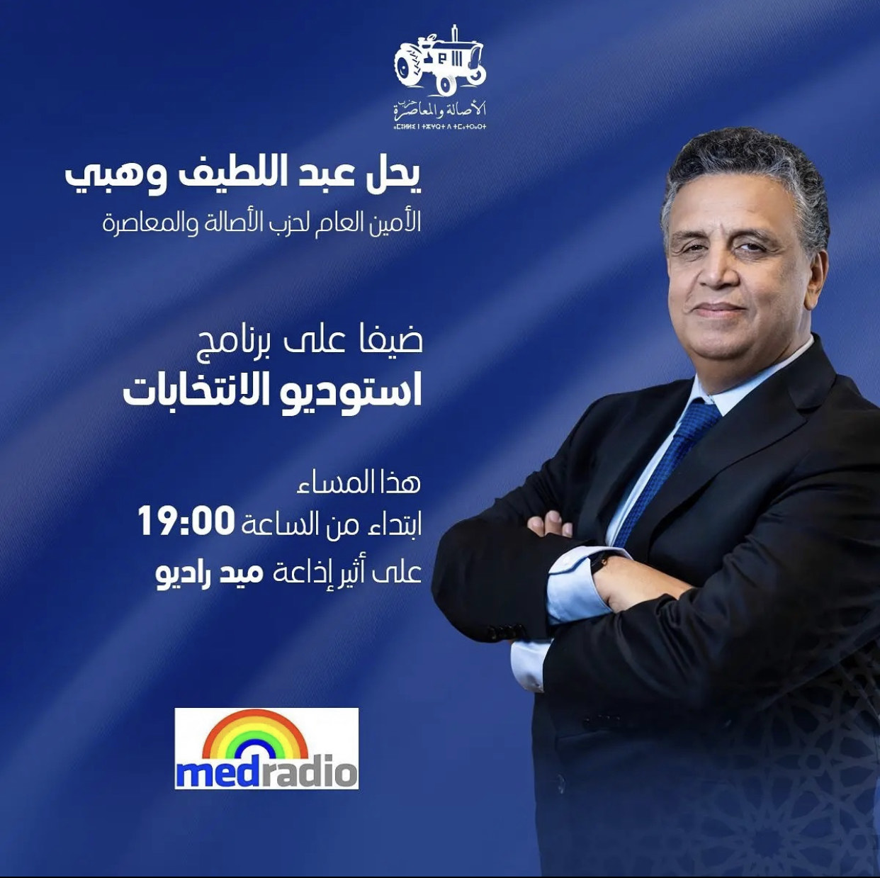 Abdelatif Ouahbi, Secrétaire général du Parti Authenticité et Modernité (PAM) sera l’invité de l’émission “استوديو الانتخابات” (studio élections) de la Radio medradio, ce mercredi soir à 19:00.