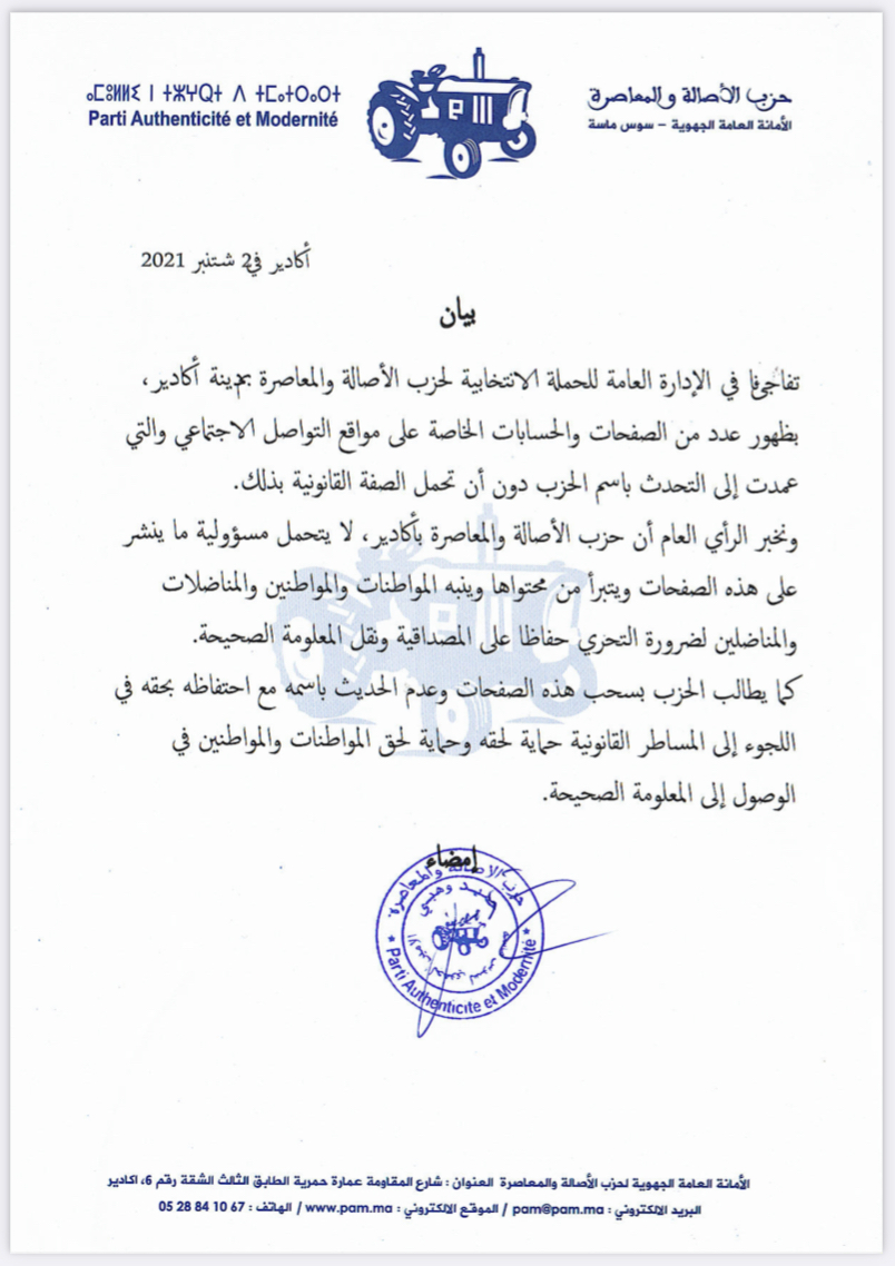 « Nous informons l’opinion publique que le PAM à Agadir ne peut être tenu responsable du contenu de ces pages et demande aux militants et aux citoyens de vérifier les informations publiées pour la préservation de la crédibilité et de la vérité », indique un communiqué du secrétariat régional du PAM à Souss-Massa.