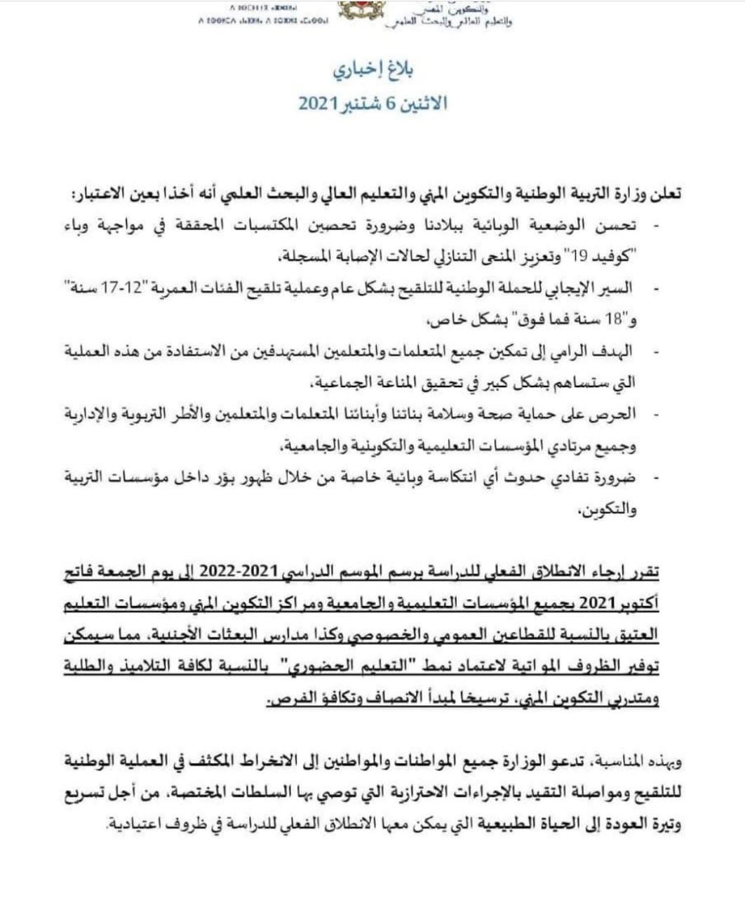 La rentrée scolaire effective au titre de l’année scolaire 2021-2022 a été reportée au 1er octobre prochain, a annoncé lundi le ministère de l’Éducation nationale, de la formation professionnelle, de l’enseignement supérieur et de la recherche scientifique.