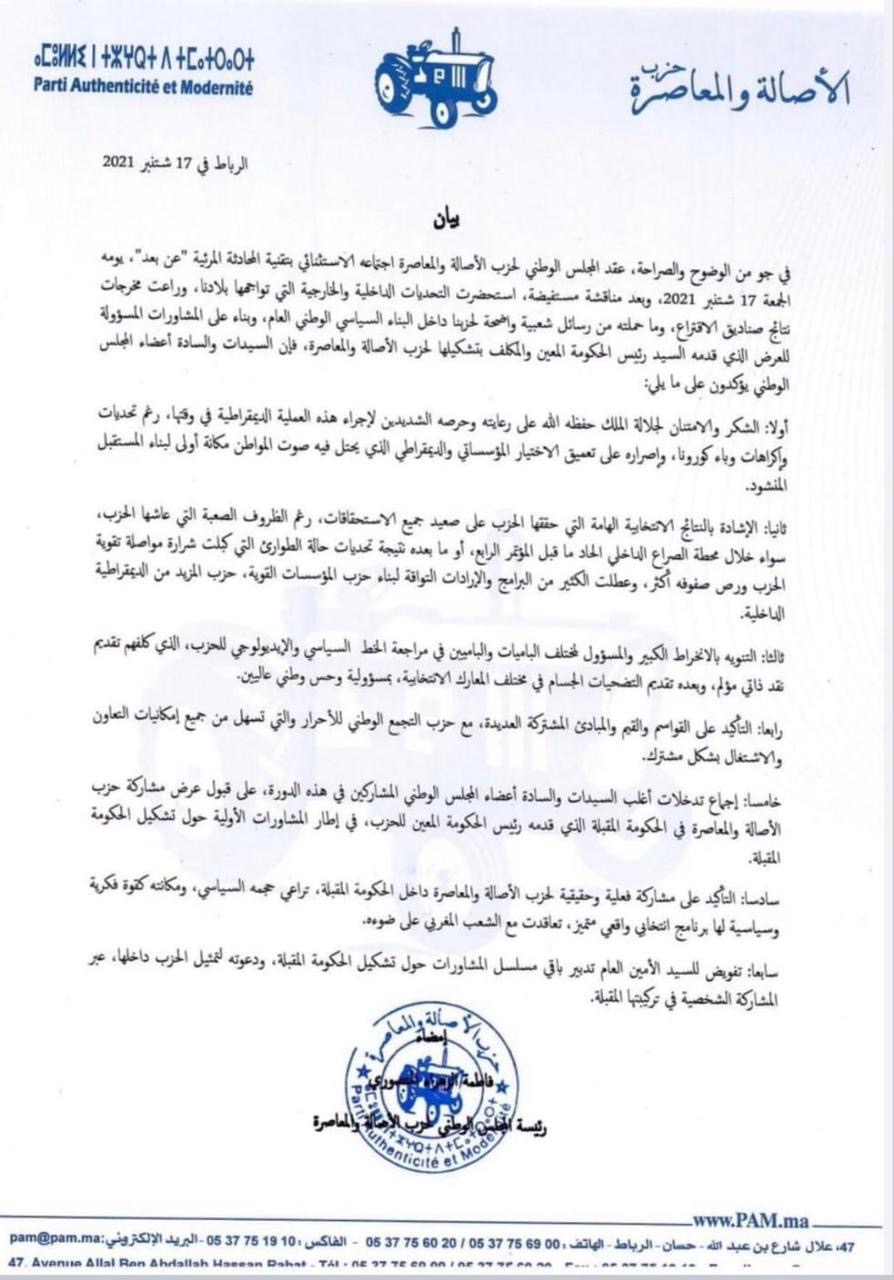 Le conseil national du Parti authenticité et modernité (PAM) a approuvé, vendredi, l’offre de participation au prochain gouvernement, présentée par le chef du gouvernement désigné, dans le cadre de ses consultations pour la formation de son cabinet.
