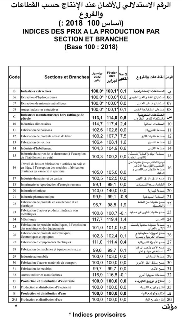Par ailleurs, les indices des prix à la production des secteurs de la «Production et distribution d’électricité» et de la «Production et distribution d’eau» ont connu une stagnation au cours du mois de février 2022.