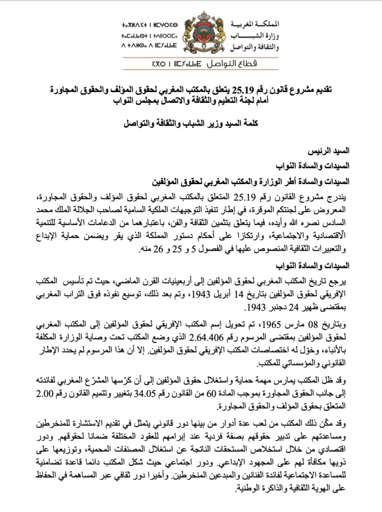 Ce texte, a-t-il ajouté, s’inscrit dans le cadre de la mise en application des hautes orientations royales relatives à la valorisation de la culture et de l’art, en tant que piliers fondamentaux du développement socio-économique, de consécration de la transparence et de la gouvernance et de promotion des conditions matérielles et morales des créateurs, d’autant plus que le Maroc a ratifié plusieurs conventions et accords internationaux, en tant que membre de l’Organisation mondiale de la propriété intellectuelle.