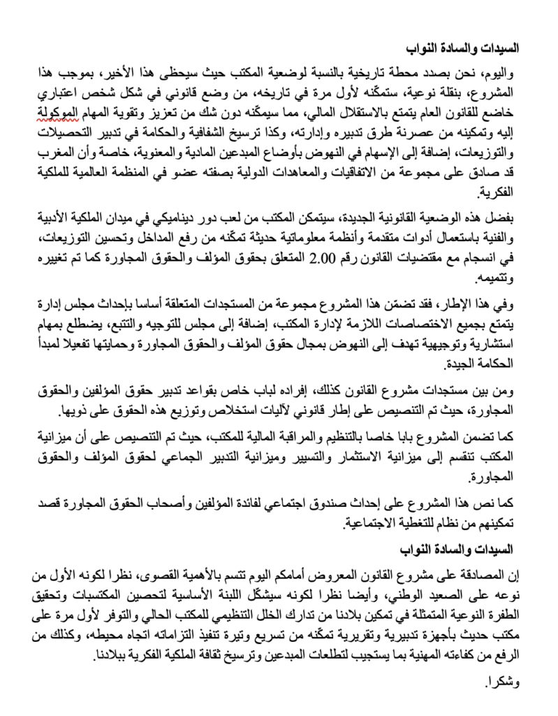 Le projet de loi comprend plusieurs nouveautés, dont la création d’un conseil d’administration jouissant des prérogatives nécessaires pour la gestion du bureau et d’un conseil d’orientation et de suivi qui aura des missions consultatives visant à protéger et promouvoir les droits d’auteur et droits voisins en application du principe de bonne gouvernance, a poursuivi M. Bensaid.