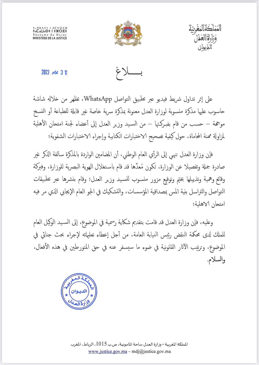Dans un communiqué rendu public, ce lundi 31 juillet, le Ministère de la Justice démenti catégorique suite à la diffusion d’une vidéo via WhatsApp, montrant un écran d’ordinateur sur lequel serait affiché un mémorandum attribué au Ministère de la Justice, intitulé « Mémorandum spécial confidentiel non imprimable et non copiable » envoyé -selon la partie qui l’a fomenté- par le ministre aux membres de la commission chargée de superviser l’examen d’aptitude à l’exercice de la profession d’avocat, sur la méthode de correction des épreuves écrites et de déroulement des épreuves orales.