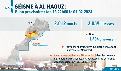 Le séisme qui a frappé, vendredi soir plusieurs provinces et préfectures du Royaume, a fait 2.012 morts et 2.059 blessés, dont 1.404 grièvement, selon un bilan provisoire du ministère de l’Intérieur, arrêté samedi à 22h00.