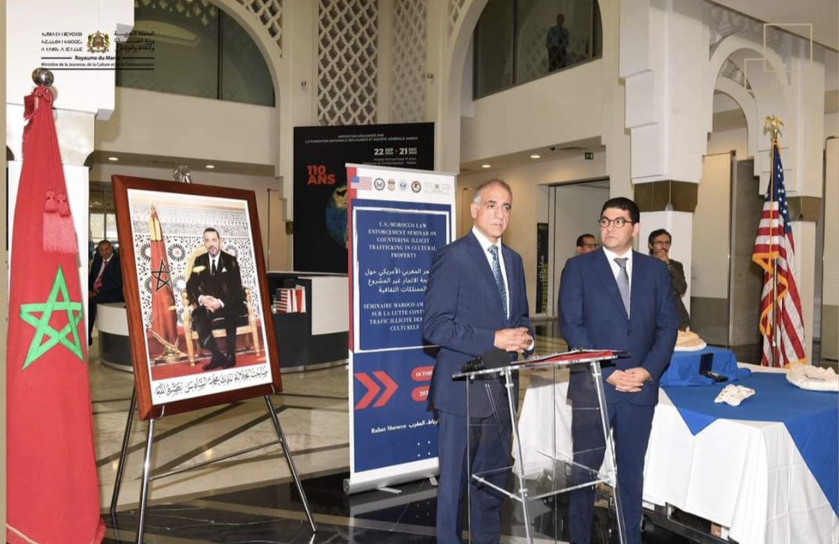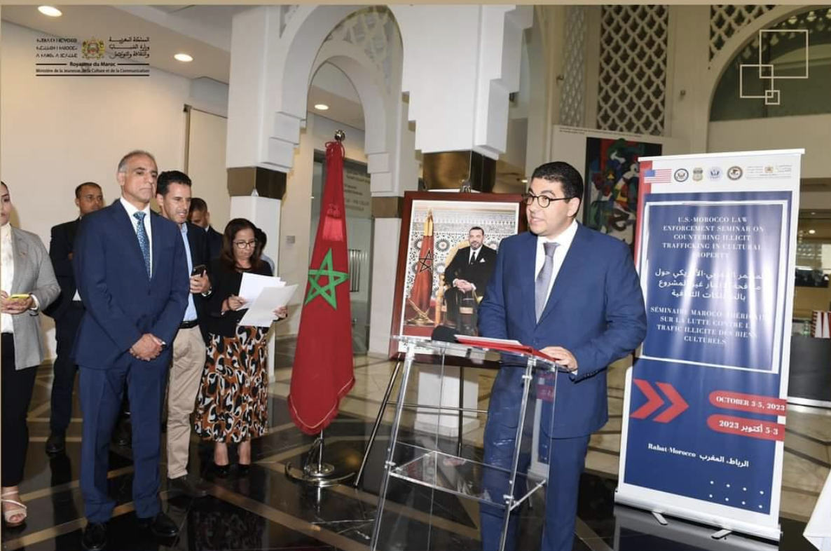 Le Ministre de la Jeunesse, de la Culture et de la Communication, M. Mehdi Bensaid, a supervisé, jeudi 5 octobre 2023, la cérémonie de clôture du séminaire maroco-américain sur la lutte contre le trafic illicite des biens culturels, au Musée Mohammed VI d’art Moderne et contemporain, en présence de l’Ambassadeur des Etats-Unis au Maroc.