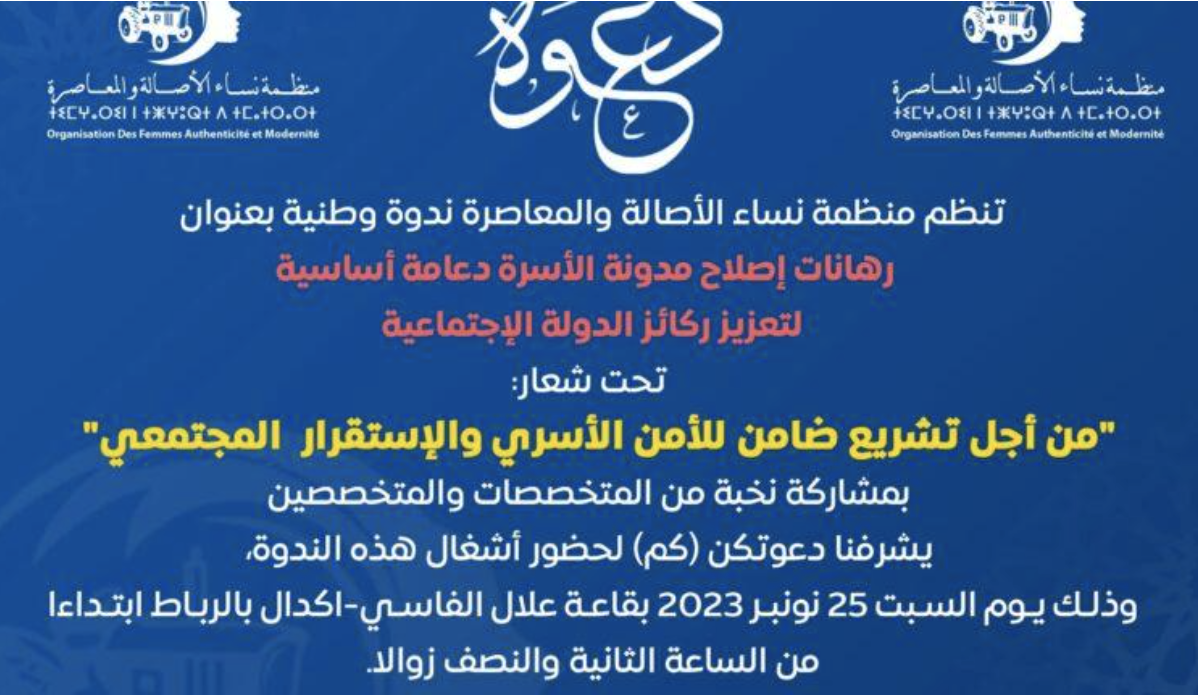 L’Organisation féminine du PAM organise un colloque national sous le thème « Les défis de la réforme du code de la famille, un élément fondamental pour renforcer les piliers sociaux de l’État », sous le slogan : «Pour une législation garantissant la sécurité familiale et la stabilité sociale».
