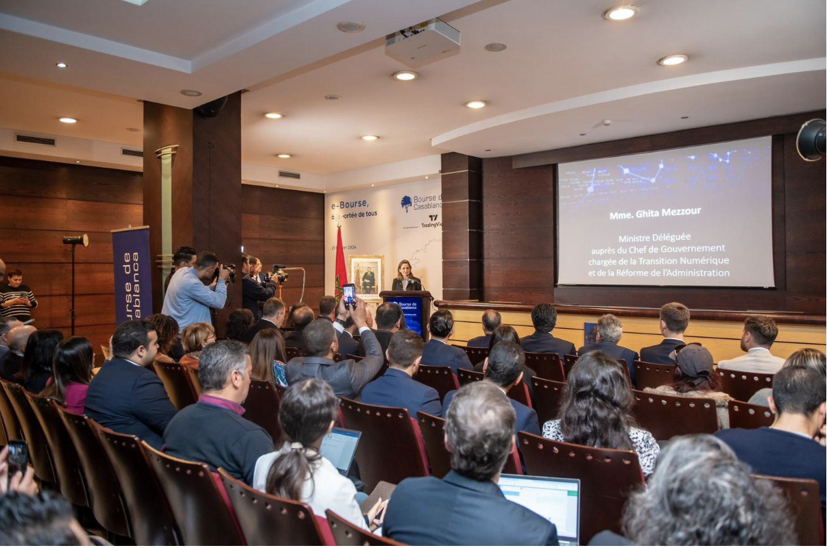 La ministre de la transition numérique et de la réforme administrative, Ghita Mezzour a pris part à la cérémonie de lancement de la plateforme numérique E-Bourse à la Bourse de Casablanca.