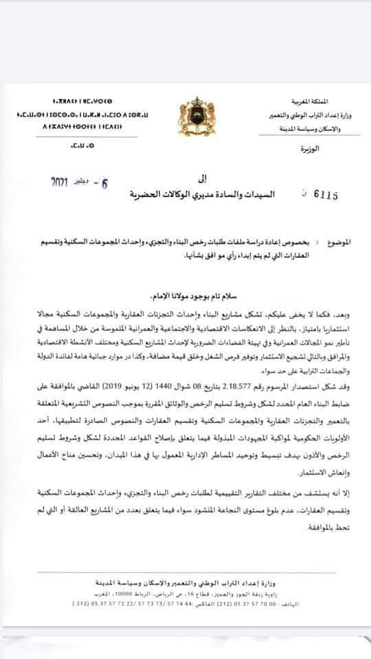 وجهت، وزيرة إعداد التراب الوطني والتعمير والإسكان وسياسة المدينة، السيدة فاطمة الوهراء المنصوري؛ دورية لمدراء الوكالات الحضرية، من أجل جرد مجموع المشاريع العالقة والملفات التي لم تحظى بموافقة اللجان التقنية المكلفة بدراسة مشاريع البناء والتجزيء وإحداث المجموعات السكنية أو التي يتم إرجاء البث فيها، وخاصة تلك الخاضعة لمسطرة المشاريع الكبرى خلال سنة 2021.