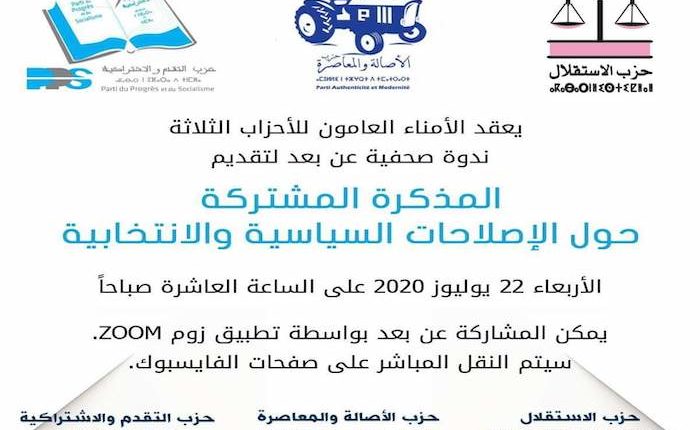 يعقد الأمناء العامون لأحزاب ” الأصالة والمعاصرة” و “الاستقلال” و “التقدم والاشتراكية”، يوم غد الأربعاء 22 يوليوز 2020، على الساعة العاشرة صباحا، ندوة صحفية “عن بعد” لتقديم “المذكرة المشتركة حول الإصلاحات السياسية والانتخابية”.