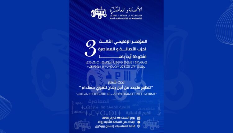 وفي هذا الصدد، تقرر تنظيم المؤتمر الإقليمي لحزب الاصالة والمعاصرة بإقليم اشتوكة ايت باها؛ يوم السبت 08 فبراير 2025 بقاعة المناسبات إحسان بمدينة بيوكرى ابتداء من الساعة الثانية زوالا، تحت إشراف الأمانة الجهوية للحزب بجهة سوس- ماسة.
