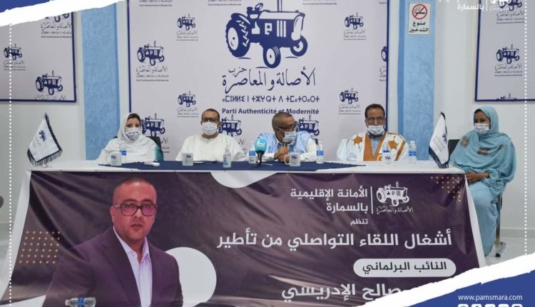 بحضور قيادات محلية وعموم مرشحات ومرشحي الحزب في الإنتخابات التشريعية والجهوية والجماعية، ترأس الأمين الإقليمي لحزب الأصالة والمعاصرة والنائب البرلماني عن إقليم السمارة للولاية التشريعية 2021- 2026، سيدي صالح الإدريسي، أشغال لقاء تواصلي موسع خصص لتدارس حصيلة الحزب  على المستويات المحلية والجهوية وكذا الوطنية، مع بحث خارطة طريق العمل للمرحلة المقبلة وتحديد آليات تنزيل المشروع الحزبي على أرض الواقع في انسجام مع الأدوار المنوطة بالمؤسسة الحزبية في تأطير وتعبئة المواطنين والمواطنات.
