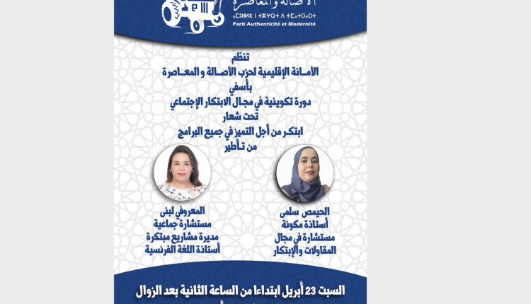 تنظم؛ الأمانة الإقليمية لحزب الأصالة والمعاصرة بأسفي، يومي السبت والأحد 23 و 24 أبريل 2022، دورة تكوينية في مجال الابتكار الاجتماعي تحت شعار: “ابتكر من أجل التميز في جميع البرامج”.