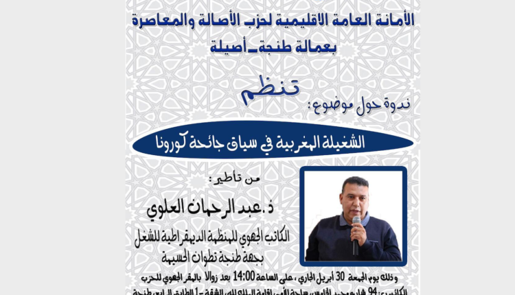 تنظم، الأمانة العامة الإقليمية لحزب الأصالة والمعاصرة بعمالة طنجة-أصيلة، ندوة تفاعلية حول موضوع: “الشغيلة المغربية في سياق جائحة كورونا”، من تأطير: ذ.عبد الرحمان العلوي، الكاتب الجهوي للمنظمة الديمقراطية للشغل بجهة طنجة تطوان الحسيمة.