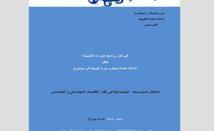 في إطار برنامج الدورات التكوينية، تنظم الأمانة العامة الإقليمية بصفرو، يوم الأحد 16 يونيو 2019 على الساعة الثالثة والنصف بالمقر الإقليمي للحزب، دورة تكوينية في موضوع “اشتغال المؤسسات الاجتماعية في إطار الإقتصاد الاجتماعي والتضامني”.