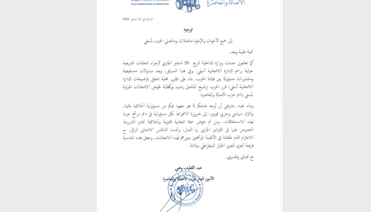الأمين العام يدعو مناضلات ومناضلي البام بآسفي لدعم مرشح الحزب رشيد بوكطاية بالانتخابات الجزئية