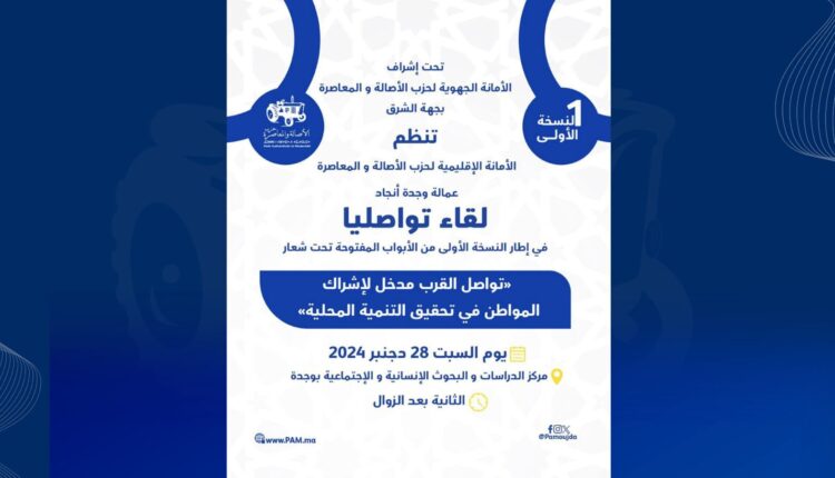 تحت إشراف الأمانة الجهوية لحزب الأصالة و المعاصرة بجهة الشرق، تنظم الأمانة الإقليمية للحزب بعمالة وجدة أنجاد، لقاء تواصليا في إطار النسخة الأولى من الأبواب المفتوحة تحت شعار “تواصل القرب مدخل لإشراك المواطن في تحقيق التنمية المحلية”.