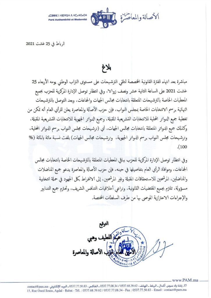 وأفاد الأمين العام للحزب بلاغ له، أنه “مباشرة بعد انتهاء الفترة القانونية المخصصة لتلقي الترشيحات على مستوى التراب الوطني يومه الأربعاء 25 غشت 2021 على الساعة الثانية عشر ونصف زوالا، وفي انتظار توصل الإدارة المركزية للحزب بجميع المعطيات الخاصة بالترشيحات المتعلقة بانتخابات مجالس الجهات والجماعات، وبعد التوصل بالترشيحات النهائية برسم الانتخابات الخاصة بمجلس النواب، فإن الحزب يعلن أن ترشيحات مجلس النواب برسم الدوائر المحلية، وترشيحات مجلس النواب برسم الدوائر الجهوية، وترشيحات مجالس الجهات بلغت نسبة مائة بالمائة (% 100(“.