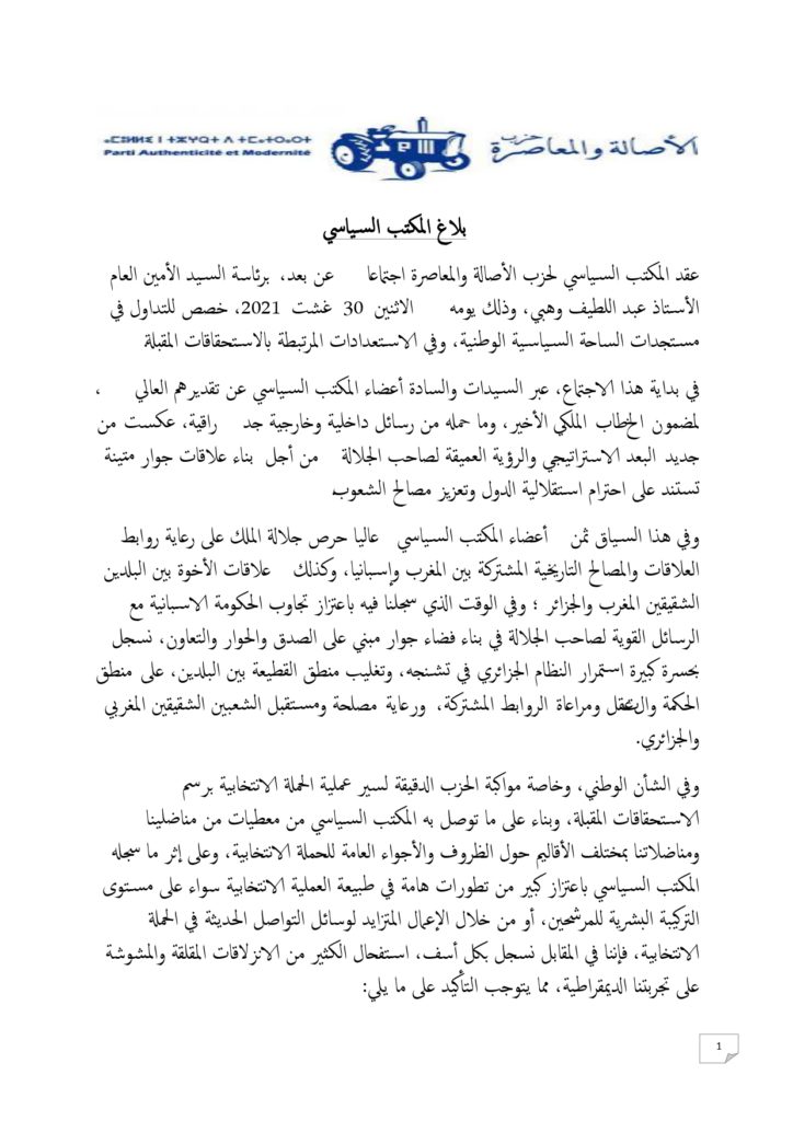 وعبر أعضاء المكتب السياسي في بلاغ صادر عقب الاجتماع الذي عقد “عن بعد” يوم أمس الاثنين 30 غشت 2021، برئاسة السيد الأمين العام الأستاذ عبد اللطيف وهبي، للتداول في مستجدات الساحة السياسية الوطنية، وفي الاستعدادات المرتبطة بالاستحقاقات المقبلة، (عبر) عن تقديرهم العالي، لمضمون الخطاب الملكي الأخير، وما حمله من رسائل داخلية وخارجية جد راقية، عكست من جديد البعد الاستراتيجي والرؤية العميقة لصاحب الجلالة من أجل بناء علاقات جوار متينة تستند على احترام استقلالية الدول وتعزيز مصالح الشعوب.