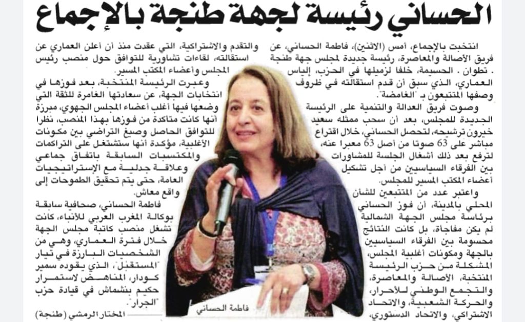 من جهتها تناولت يومية “المساء” الخبر، ونشرت أن فاطمة الحساني، الصحافية السابقة بوكالة المغرب العربي للأنباء، انتخبت رئيسة لمجلس جهة طنجة تطوان الحسيمة، مكان إلياس العماري، الذي اعتبرته الداخلية في بلاغ سابق “منقطعا عن العمل”، بعد سحب منافسها سعيد خيرون ترشيحه قبل انطلاق عملية التصويت.