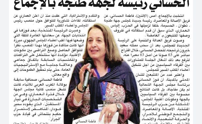من جهتها تناولت يومية “المساء” الخبر، ونشرت أن فاطمة الحساني، الصحافية السابقة بوكالة المغرب العربي للأنباء، انتخبت رئيسة لمجلس جهة طنجة تطوان الحسيمة، مكان إلياس العماري، الذي اعتبرته الداخلية في بلاغ سابق “منقطعا عن العمل”، بعد سحب منافسها سعيد خيرون ترشيحه قبل انطلاق عملية التصويت.