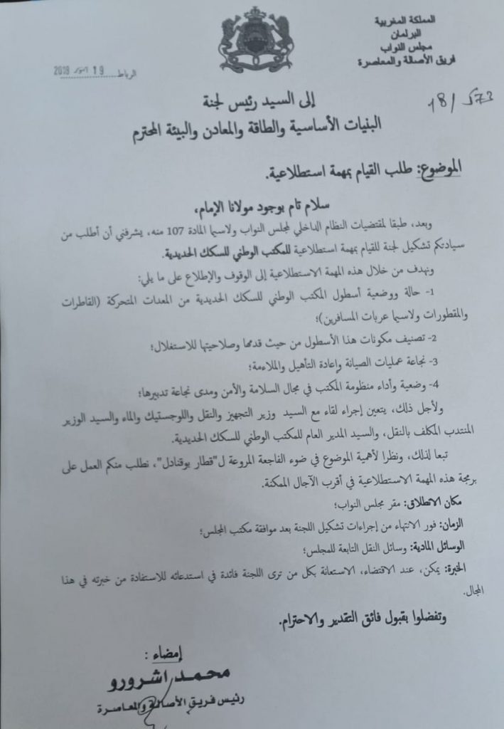وجه، اليوم، الفريق النيابي للأصالة والمعاصرة رسالة عاجلة لرئيس لجنة البنيات والطاقة والمعادن والبيئة، يطالبها بتشكيل على وجه السرعة لجنة برلمانية للقيام بمهمة استطلاعية للمكتب الوطني للسكك الحديدية، وذلك طبقا لمقتضيات المادة 107 من النظام الداخلي لمجلس النواب.