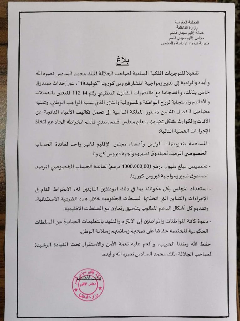 أعلن المجلس الإقليمي لسيدي قاسم عن مساهمته بمبلغ مليون درهم لفائدة الحساب الخصوصي المرصد لصندوق تدبير ومواجهة فيروس كورونا، إضافة إلى المساهمة بتعويضات الرئيس وأعضاء مجلس الإقليم لشهر واحد لفائدة ذات الصندوق.
