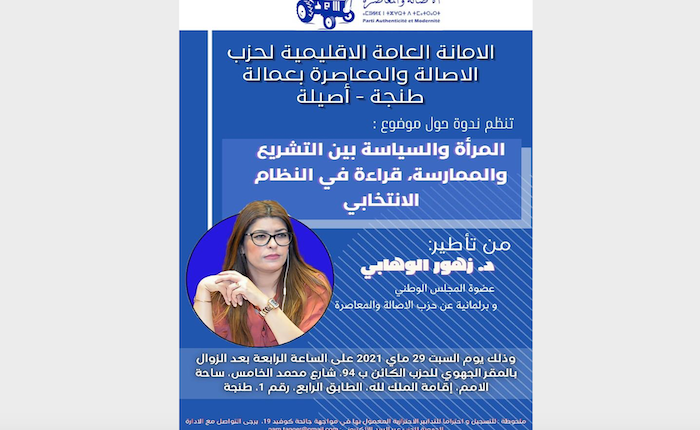 تنظم، الأمانة العامة الإقليمية لحزب الأصالة والمعاصرة بعمالة طنجة- أصيلة، ندوة حول موضوع: “المــــرأة والسياسة بين التشريع والممارسة، قراءة في النظام الانتخابي”، من تأطير عضو المجلس الوطني- البرلمانية عن فريق الأصالة والمعاصرة بمجلس النواب، السيدة زهور الوهابي.