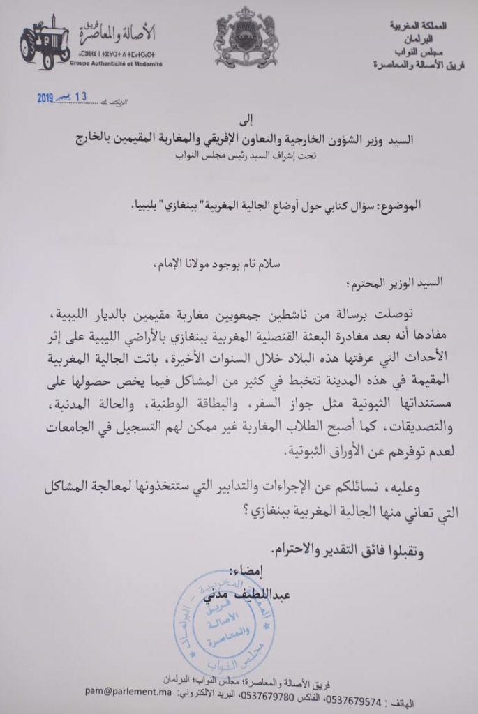 وجه النائب البرلماني عبد اللطيف مدني، يوم الجمعة 13 دجنبر 2019، سؤالاً كتابياً إلى وزير الشؤون الخارجية والتعاون الإفريقي والمغاربة المقيمين بالخارج، حول أوضاع الجالية المغربية “ببنغازي” بليبيا.