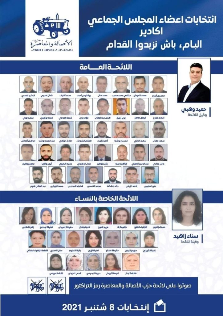 ويتقدم رجل الأعمال والصيدلاني حميد وهبي رأس قائمة اللائحة المحلية لما راكمه من خبرة وتجربة غنية على المستوى السياسي والاقتصادي، على جانب درايته الجيدة ورؤيته السديدة لمفاتيح التنمية لحاضرة سوس. في حين أوكل للناشطة السياسية الأمازيغية سناء زهيد قيادة اللائحة الاضافية النسائية وهي العضو السابق للمجلس التي اصطفت في صف المعارضة وكانت الصوت المعارض الصادح بالانتقاد البناء في وجه السياسات الخبط عشواء لمدبري الشأن المحلي لأكادير خلال الولاية السابقة.