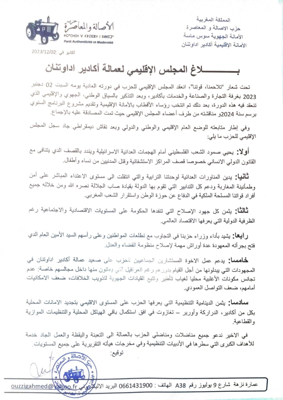 هذا وأصدر أعضاء المجلس الإقليمي للحزب بأكادير إداوتنان إصدار بلاغ تضمن دعم كل جهود الإصلاح التي تنفدها الحكومة، والإشادة بأداء وزراء الحزب في التجاوب مع تطلعات المواطنين وعلى رأسهم الأمين العام للحزب- وزير العدل الذي أطلق بجرأته المعهودة عدة أوراش مهمة لإصلاح منظومة القضاء والعدل. كما ثمنوا الدينامية التنظيمية التي يعرفها الحزب على المستوى الإقليمي. كما حييوا صمود للشعب الفلسطيني في مواجهة العدوان الذي يتعرض له، وأدانوا أيضا المناورات العدائية لوحدتنا الترابية.