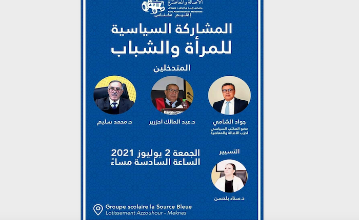 تنظم، الأمانة العامة الإقليمية لحزب الأصالة والمعاصرة بمكناس، ندوة حول موضوع “المشاركة السياسية للمرأة والشباب”، ويؤطرها كل من السادة: عضو المكتب السياسي للحزب، السيد جواد الشامي، و الدكتور عبد المالك أحزرير، والدكتور محمد سليم.