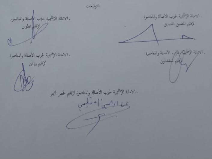 وتلتزم الأمانات العامة الإقليمية لحزب الأصالة والمعاصرة الموقعة أسفله باحترام جميع قرارات الأمين العام و قرارات اللجنة التحضيرية الشرعية التي يترأسها الأخ أحمد التهامي.