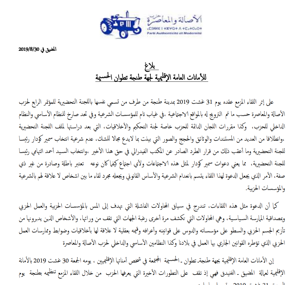 على إثر اللقاء المزمع عقده يوم 31 غشت 2019 بمدينة طنجة من طرف من تسمي نفسها باللجنة التحضيرية للمؤتمر الرابع لحزب الأصالة والمعاصرة حسب ما تم الترويج له بالمواقع الاجتماعية ،في غياب تام للمؤسسات الشرعية وفي تحد صارخ للنظام الأساسي والنظام الداخلي للحزب، وكذا مقررات اللجان الدائمة للحزب خاصة لجنة التحكيم والأخلاقيات، التي بعد دراستها لملف اللجنة التحضيرية ،وانطلاقا من العديد من المستندات والوثائق والحجج والصور التي بينت بما لايدع مجالا للشك، عدم شرعية انتخاب سمير كودار رئيسا للجنة التحضيرية وما أعقب ذلك من قرار الطرد الصادر عن المكتب الفيدرالي في حق هذا الأخير ، وانتخاب السيد أحمد التهامي رئيسا للجنة التحضيرية، مما يعني دعوات سمير كودار لمثل هذه الاجتماعات ولأي اجتماع كيفما كان نوعه تعتبر باطلة وصادرة من غير ذي صفة، الأمر الذي يجعل الدعوة لهذا اللقاء يتسم بانعدام الشرعية والأساس القانوني ويجعله مجرد لقاء ما بين أشخاص لا علاقة لهم بالشرعية والمؤسسات الحزبية.