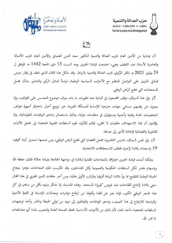 وبهذه المناسبة، إذ تقدمت قيادتي حزب العدالة والتنمية وحزب الأصالة والمعاصرة بالشكر والتنويه لكل من ساهم في كل هذا المنجز الوطني الكبير، فإننا نعبر عن قلقنا وتخوفنا من ارتفاع مؤشرات ومعدلات الإصابة في الفترة الأخيرة والمرشحة للارتفاع في هذا الصيف، داعية في الوقت نفسه المواطنات والمواطنين إلى مزيد من توخي الحيطة والحذر وأخذ توجيهات السلطات المختصة مأخذ الجد، لأن ذلك من الأدوات الأساسية لحفظ الصحة العامة ولتجنيب بلدنا أي مضاعفات لا قدر الله.