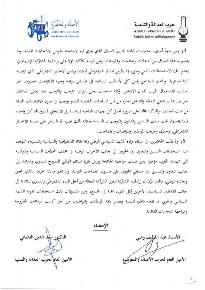 ومن جهة أخرى، استعرضت قيادتا الحزبين السياق الذي يجري فيه الاستعداد لخوض الانتخابات المقبلة، وما يتسم به هذا السياق من تفاعلات وتدافعات وممارسات، وهي فرصة للتأكيد أولا على إرادتهما المشتركة للإسهام في إنجاح تلك الاستحقاقات بنَفَسٍ وطني، بما يكرس المسار الديمقراطي لبلادنا ويثمن الاختيار الديمقراطي الذي ارتضته ثابتا دستوريا، وللتعبير ثانيا عن رفض كل الأساليب الساعية إلى المساس بنزاهة وحرية الاقتراعات خصوصا عبر أساليب الاستعمال المريب للمال الانتخابي وكذا استعمال بعض أدوات الترغيب والترهيب ضد بعض الفاعلين الحزبيين، مما يستدعي اليقظة والتدخل الحازم من قبل السلطات المختصة للقيام بواجبها في صون الانتخابات المقبلة من عبث العابثين، وللتأكيد ثالثا على ضرورة تحمل كل الجهات الفاعلة في المسلسل الانتخابي لمسؤولياتها كل واحدة فيما يخصها، تحت سقف الدستور والقانون والتوجيهات السامية لجلالة الملك نصره الله الساهر على صيانة الاختيار الديمقراطي، وحقوق وحريات المواطنين والمواطنات والجماعات.