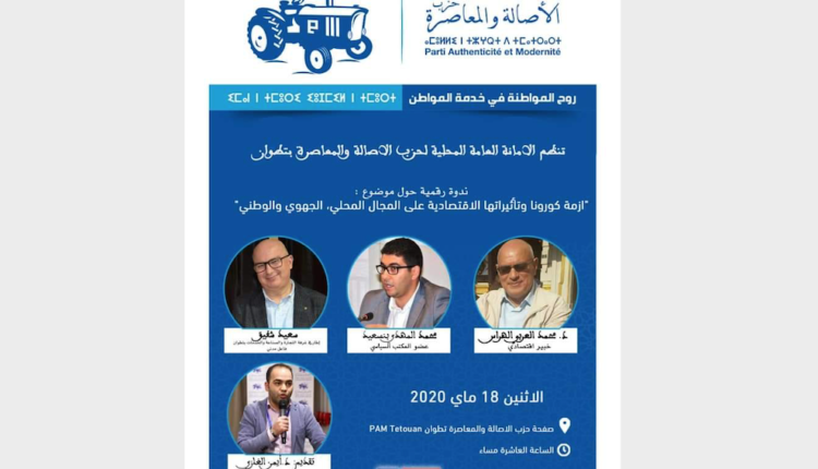 تنظم الأمانة العامة المحلية لحزب الأصالة والمعاصرة بتطوان ندوة رقمية حول موضوع: “أزمة كورونا وتأثيراتها الاقتصادية على المجال المحلي، الجهوي والوطني”، وذلك على الساعة العاشرة مساء من يوم الإثنين 18 ماي 2020.